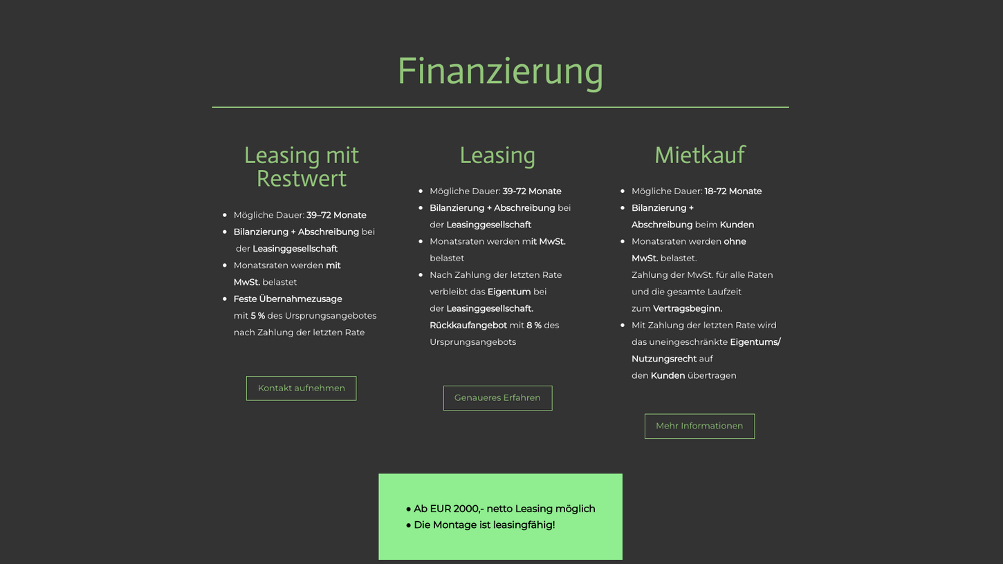 Neben der Darstellung von Leistungen und Referenzen wurde auch ein CTA-orientierter Bereich integriert, der zur direkten Kontaktaufnahme oder zur Einreichung von Förderanträgen animiert.